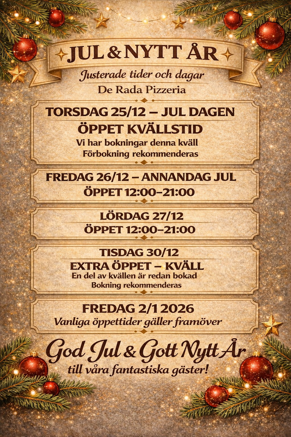 Hos oss möter du äkta napolitansk pizza, bakad med stolthet, passion och kärlek – mitt i hjärtat av Nässjö. Äkta hantverk från Neapel Napolitansk pizza är mer än bara mat – det är ett hantverk som förädlats i århundraden i Neapel. Hemligheten ligger i den långjästa degen, som får vila i minst 40 timmar för att utveckla sin unika smak och luftiga struktur. Bottnen blir tunn och mjuk i mitten, men med en luftig och lätt bränd kant som bara en stenugn på 500°C kan ge. Varje pizza formas för hand, bakas snabbt och serveras direkt – precis som traditionen kräver. Till skillnad från den pizza man oftast hittar i Sverige är napolitansk pizza lättare och mer balanserad. Den tunna bottnen, den långjästa degen och de noggrant utvalda råvarorna gör att pizzan inte känns tung i magen – den är gjord för att njutas, inte övermätta. Råvaror med själ Vi kompromissar aldrig med kvaliteten – varje råvara är vald med stolthet och omsorg. För att bevara den äkta smaken importerar vi det mesta direkt från Italien: från San Marzano-tomater och buffelmozzarella till finaste olivoljan, utvalda ostar, prosciutto och våra noggrant utvalda viner. Det är råvarorna som gör skillnaden – och vi är stolta över att låta Nässjö få uppleva smaker som annars hör hemma på de livliga gatorna i Neapel. Nässjös egna smak av Italien Napolitansk pizza är så speciell att den har erkänts som ett UNESCO-världsarv – och nu finns detta unika kulturarv även här i Nässjö. Vi är stolta över att föra en del av Neapels matkultur till vår stad och skapa något som både smakar och känns större än bara en måltid. Hos oss skapas oförglömliga kvällar – med doften av nygräddad pizza, samtal som dröjer sig kvar och en atmosfär som för människor närmare varandra. Hos De Rada får Nässjö mer än bara pizza – här får du en smakupplevelse i världsklass, med stolthet och hjärta i varje tugga.